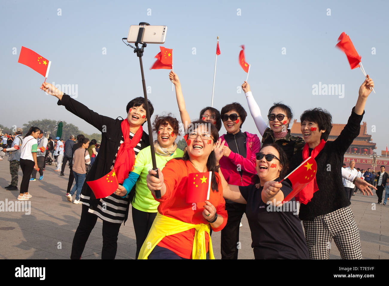 October 1 2017 Beijing China A Group Of Women Seen Holding Flags During The National Day Ceremony On National Day Many Chinese People Go To Tiananmen Square To Pose For Photos